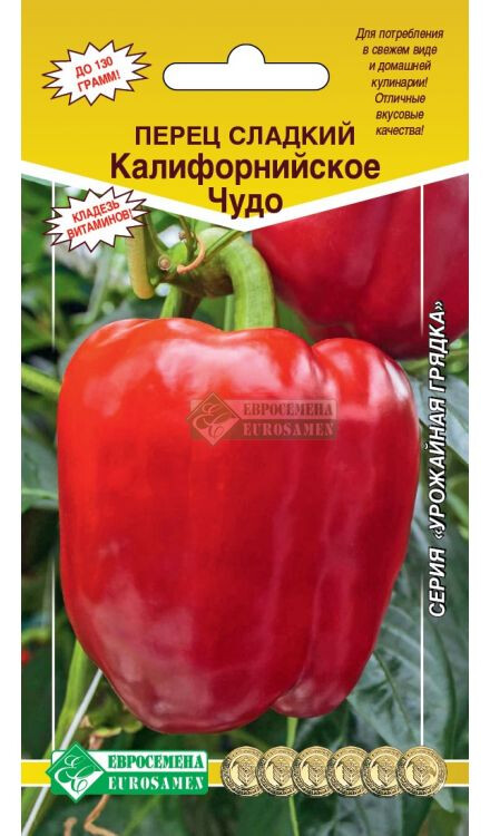 Болгарский сладкий перец должен присутствовать ежедневно у каждого на столе. Съев один крупный перец, можно полностью перекрыть суточную потребность в витаминах С и А. Сегодня многие люди по достоинству оценили полезные свойства болгарского перца, особенно привлекает он гурманов за сочную хрустящую текстуру, характерный вкус и разнообразие цвета. Калифорнийское Чудо- среднеранний сорт перца, период от полных всходов до технической спелости 109-129 дней. Плоды висячие, кубовидные, гладкие, глянцевые, в технической спелости – зеленые, а в биологической спелости – красные. Число гнезд 3-4. Толщина стенок 4,0-5,4 мм, до 8,3 мм. Масса плодов 80-128 г. Вкусовые качества отличные. Аромат сильный. Используется для потребления в свежем виде, домашней кулинарии, консервирования. Длительное время сохраняет товарный вид.