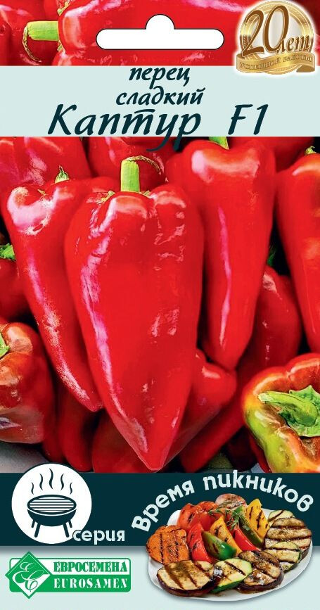 Овощи на гриле, а также овощной шашлык — здоровая альтернатива блюдам из жареных продуктов, их можно подать в качестве закуски или гарнира, из них получается прекрасный салат — теплый или холодный. Овощная серия Время Пикников разработана специально для осуществления этих целей и включает сорта и гибриды овощей с малым количеством влаги и семечек. Их легко и быстро можно приготовить, предварительно замариновав их или приправив уже готовые овощи сыром, различными соусами, зеленью или маринадом с ароматными специями. К таким овощам хорошо подать кусочки хлеба, поджаренного на гриле. Перец Каптур- среднеспелый гибрид (70-75 дней). Плоды 2-3-х камерные, конической формы, массой 160-180 г., с толщиной стенки 6-7 мм. Гибрид прекрасен для свежего потребления, различных видов переработки (в т.ч. для запекания на гриле).
