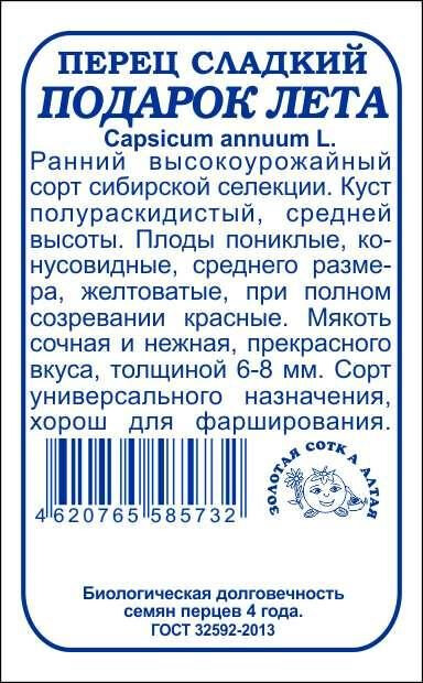 Ранний высокоурожайный сорт сибирской селекции для открытого грунта и пленочных укрытий. Растение полураскидистое, средней высоты. Плоды пониклые, конусовидной формы, среднего размера, в технической спелости желтоватые, в биологической – красные. Мякоть сочная и нежная, отличного вкуса, толщиной 6-8 мм. Сорт используется в свежем виде, для консервирования и переработки, особенно хорош для фарширования. Устойчив к пониженным температурам.