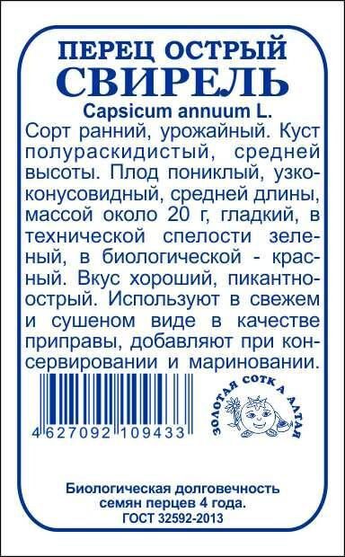 Ранний урожайный сорт для возделывания в открытом грунте. Растение полураскидистое, средней высоты. Плоды пониклые, узкоконусовидные, средней длины, массой около 20 г, гладкие, глянцевые, в технической спелости зеленые, в биологической - красные. Вкус хороший, пикантно-острый. Используют в качестве приправы, при изготовлении настоек и консервировании.