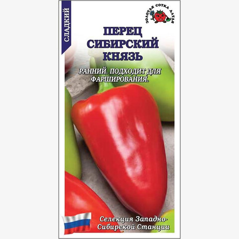 Ранний высокоурожайный сорт сибирской селекции для открытого грунта и пленочных укрытий. От всходов до плодоношения 106-114 дней. Растение высокое, полураскидистое. Плоды конусовидные, массой 90-150 г, в технической спелости желтоватые, в биологической – темно-красные. Мякоть сочная, сладкая и ароматная. Сорт используется в свежем виде, для заготовок на зиму и фарширования.