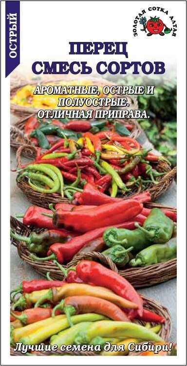 Смесь высокоурожайных сортов, созревающих в разные периоды: раннеспелые, среднеранние и среднеспелые. Растения отлично развиваются в открытом грунте и теплицах. Плоды разнообразны по форме и цвету, мелкие или среднего размера, очень ароматные. Вкус хороший, пикантный, различной степени остроты. Острые перцы используются в качестве приправы, при изготовлении настоек и консервировании.