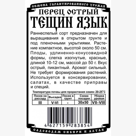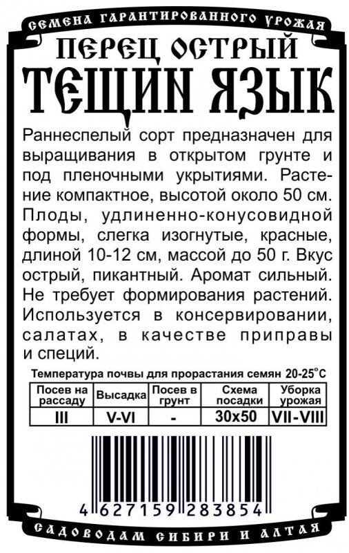 Раннеспелый сорт предназначен для выращивания в открытом грунте и под пленочными укрытиями. Растение компактное, высотой около 50 см. Плоды, удлиненно-конусовидной формы, слегка изогнутые, красные, длиной 10-12 см, массой до 50 г. Вкус острый, пикантный. Аромат сильный. Не требует формирования растений. Используется в консервировании, салатах, в качестве приправы и специй.