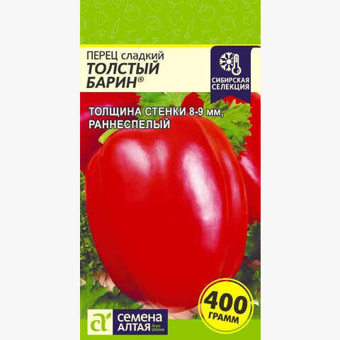 Селекция Агрофирмы Семена Алтая. Раннеспелый (90-100 дней) урожайный сорт. Плоды в виде усеченного конуса, массой до 400 г, сладкие, ароматные, в биологической спелости красные, толщина стенки 8-9 мм. Выращивают в открытом или защищенном грунте. Ценится за вкусовые качества и высокую урожайность. Место посадки: легкие плодородные нейтральные почвы. Выращивают после моркови, капусты, свеклы, бобовых и тыквенных культур Освещение: обильное, переносит легкое затенение Предпосевная подготовка: для стимулирования прорастания перед посевом семена перца замочить на 15 минут в 1% растворе марганцовки, затем промыть и подсушить Сроки посева: за 75-85 дней до высадки (февраль-март) Посев на рассаду: семена раскладывают на влажный плодородный рыхлый нейтральный грунт, предварительно хорошо уплотнив основание. Присыпают слоем грунта 0,8-1 см, уплотняют, обильно поливают, накрывают пленкой и размещают в теплом месте. Оптимальная температура для проращивания перца 25-27°С. При температуре грунта 15°С и ниже появление всходов затягивается до 4-6 недель Посев в грунт: не предусмотрено Пикировка/перевалка: сеянцы переваливают в отдельные стаканы 0,5 л грунта в фазе 2-4 настоящих листьев без заглубления. Корневая шейка должна оставаться на уровне рассадного ящика. Высадка в грунт: производится в возрасте рассады 75-85 дней, когда почва прогреется до 15°С и минует угроза возвратных заморозков. Рассаду закаливают. Растения высаживают на расстоянии 40 см друг от друга Уход: сорта перцев от Семена Алтая не требуют формировки. Растения рекомендовано подвязывать. Полив равномерный, почва всегда должна оставаться слегка увлажненной Сбор урожая: начинают в фазе технической спелости (зеленые и белые плоды), продолжают по мере созревания