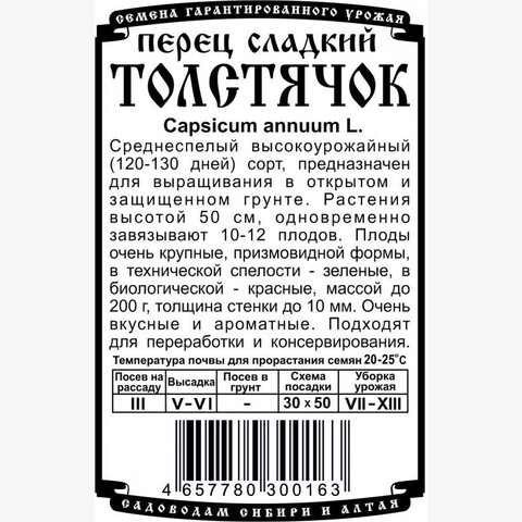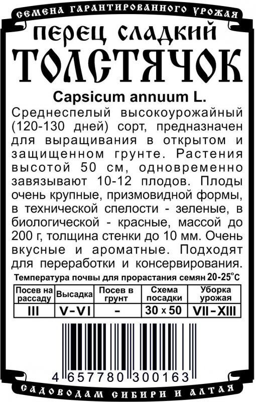 Среднеспелый высокоурожайный (120-130 дней ) сорт, предназначен для выращивания в открытом и защищенном грунте. Растения полураскидистые, высотой 50 см, одновременно завязывают 10-12 плодов. Плоды очень крупные, призмовидной формы, в технической спелости - зеленые, в биологической - красные, массой до 200 г, толщина стенки до 10 мм. Очень вкусные и ароматные. Подходят для переработки и консервирования.