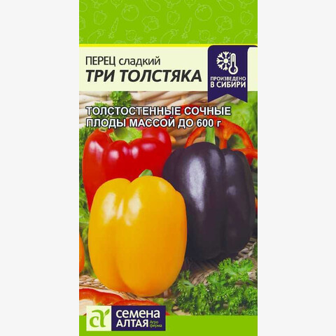 Представляет собой смесь 3 превосходных сортов: желтый, красный и черный. Смесь подобрана, исходя из предпочтений покупателей: все перцы крупноплодные, массой в среднем 200-300 г и толстостенные (8-10 мм), отличаются замечательным вкусом и ароматом. Высокая урожайность, транспортабельность, привлекательный внешний вид, отличные вкусовые и товарные качества, уникальность использования - определяют достоинства Трех Толстяков. Подходит для выращивания в открытом грунте, теплицах и под пленочными укрытиями. Место посадки: легкие плодородные нейтральные почвы. Выращивают после моркови, капусты, свеклы, бобовых и тыквенных культур Освещение: обильное, переносит легкое затенение Предпосевная подготовка: для стимулирования прорастания перед посевом семена перца замочить на 15 минут в 1% растворе марганцовки, затем промыть и подсушить Сроки посева: за 75-85 дней до высадки (февраль-март) Посев на рассаду: семена раскладывают на влажный плодородный рыхлый нейтральный грунт, предварительно хорошо уплотнив основание. Присыпают слоем грунта 0,8-1 см, уплотняют, обильно поливают, накрывают пленкой и размещают в теплом месте. Оптимальная температура для проращивания перца 25-27°С. При температуре грунта 15°С и ниже появление всходов затягивается до 4-6 недель Посев в грунт: не предусмотрено Пикировка/перевалка: сеянцы переваливают в отдельные стаканы 0,5 л грунта в фазе 2-4 настоящих листьев без заглубления. Корневая шейка должна оставаться на уровне рассадного ящика. Высадка в грунт: производится в возрасте рассады 75-85 дней, когда почва прогреется до 15°С и минует угроза возвратных заморозков. Рассаду закаливают. Растения высаживают на расстоянии 40 см друг от друга Уход: не требует формировки. Растения рекомендовано подвязывать. Полив равномерный, почва всегда должна оставаться слегка увлажненной Сбор урожая: начинают в фазе технической спелости (зеленые и белые плоды), продолжают по мере созревания