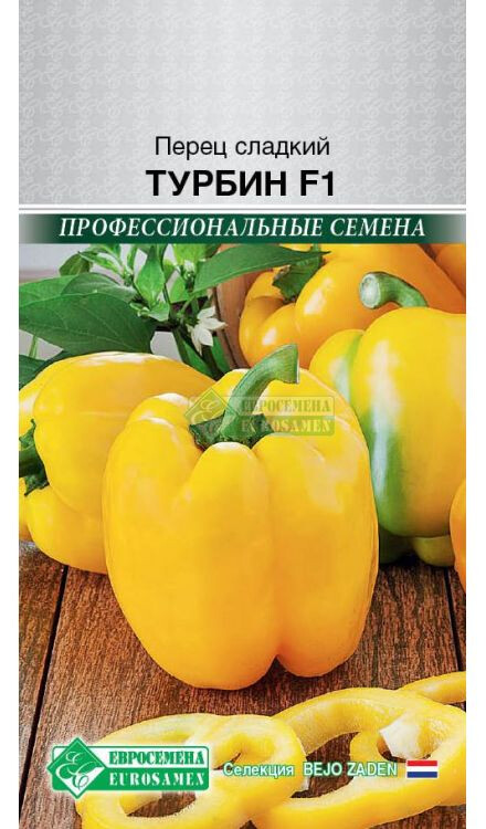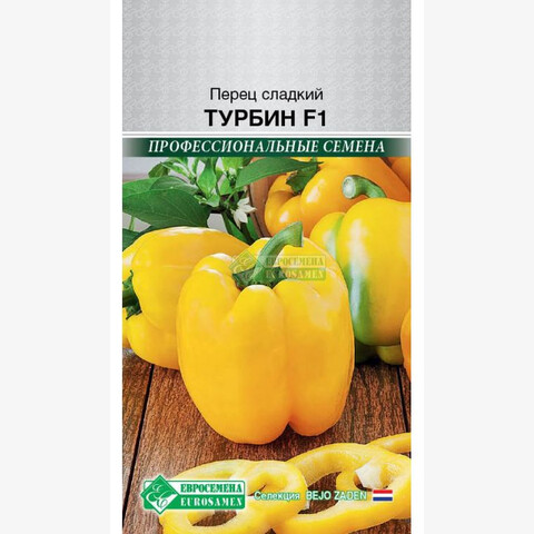 Болгарский сладкий перец должен присутствовать ежедневно у каждого на столе, съев один крупный перец можно полностью перекрыть суточную потребность в витамине С и А. Сегодня многие люди по достоинству оценили полезные свойства болгарского перца, особенно привлекает он гурманов за сочную хрустящую текстуру, характерный вкус и разнообразие цвета. Турбин- среднеранний жаростойкий высокоурожайный гибрид для выращивания в открытом и защищенном грунте. Растение полу раскидистое, низкорослое или средней высоты. Период от высадки рассады до технической спелости 55-60 дней. Плоды кубовидные, массой 100-160г, пониклые. В фазе технической спелости перцы светло-зеленые, в биологической спелости– насыщенной желтой или темно-желтой окраски, 3-4-гнездные. Поверхность плодов гладкая, кожица глянцевая, толщина стенки до 8мм. Гибрид универсального назначения: свежие плоды имеют превосходный сладкий вкус, а также отлично подходят для всех видов кулинарной обработки и консервирования. Урожайность в открытом грунте достигает 6 кг/м². Устойчив к вирусу табачной мозаики. Семена инкрустированы. Перед посевом не замачивать!