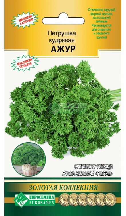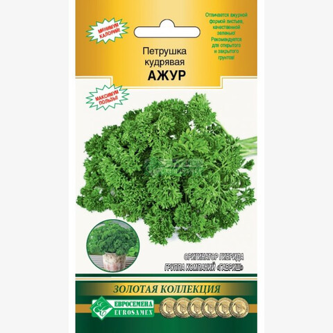 Практически каждый огородник выращивает на своих грядках пряные травы. В России пальму первенства удерживают укроп и петрушка, без них трудно представить овощные салаты, борщи, щи и тем более разные соленья. Зелень петрушки, с ее многочисленными полезными свойствами, используется для приготовления различных блюд, причем добавляют ее как в свежем виде, так и в сушеном. Корневая часть добавляется в подливы, соусы и первые блюда. Семена используются при консервировании овощей. Свежие листья служат превосходным украшением блюд, придавая им пикантность и аппетитность. В народной медицине ее используют для укрепления десен и как средство, сохраняющее зрение. Ажур- среднеспелый (70-80 дней от появления всходов до начала товарной годности) листовой сорт кудрявой петрушки, рекомендованный для открытого и защищенного грунта. Средняя масса растения 110 г. Отличается ажурной формой листьев, качественной зеленью.
