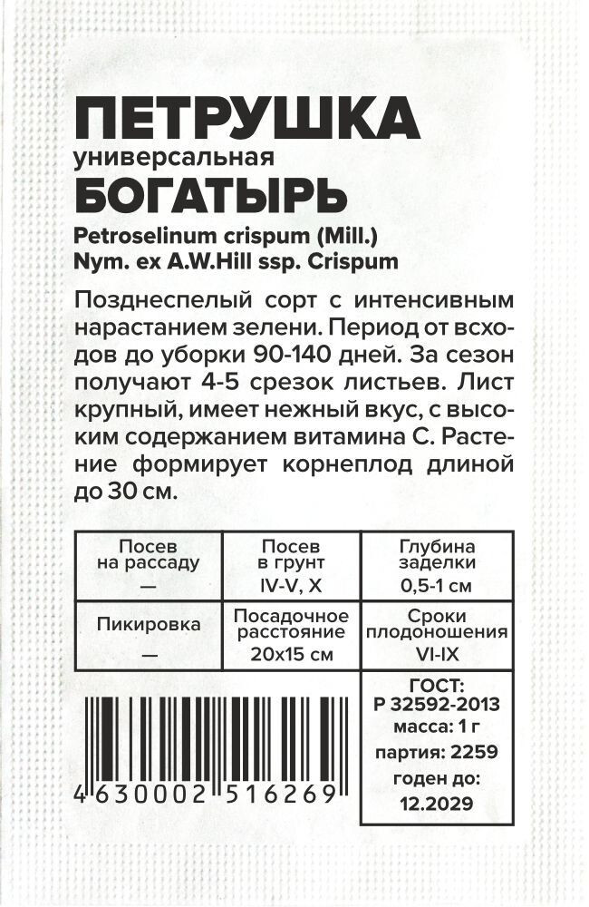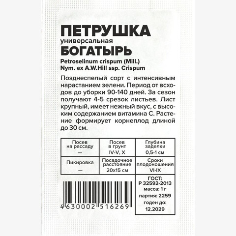 Позднеспелый сорт с интенсивным нарастанием зелени. Период от всходов до уборки 90-140 дней. За сезон получают 4-5 срезок листьев. Розетка листьев полуприподнятая. Лист крупный, темно-зеленый, имеет нежный и приятный вкус, с высоким содержанием витамина С. Растение формирует корнеплод: крупный, ровный, белый, длиной до 30 см. Сорт теневынослив, морозостоек. Рекомендуется для употребления в свежем виде и приготовления блюд. Место посадки: предпочитает плодородные, нейтральные, рыхлые почвы. Тяжелые почвы для нее не пригодны. Лучшие предшественники – огурец, лук, картофель, кроме растений семейства сельдерейные Освещение: обильное, выносит затенение Предпосевная подготовка: не требуется, для более ранних и дружных всходов перед посевом можно замочить семена на 10-15 минут в воде температурой +50°С Сроки посева: при прогревании почвы до +10...12°С (апрель-май), возможен подзимний посев (октябрь-ноябрь). Всходы переносят заморозки возвратные заморозки до -7°С Посев на рассаду: не предусмотрен Посев в грунт: семена раскладывают в бороздки глубиной 0,5-1 см на уплотненный увлажненный грунт, оставляя междурядья 15-20 см. Можно сеять в лунки для получения пучков Пикировка/перевалка: осенью растения можно пересадить в контейнеры и продолжить выращивание в комнатных условиях Уход: заключается в прополке, поливе и подкормках по необходимости. Для омоложения растений во второй половине лета можно провести стрижку Сбор урожая: проводят по мере отрастания зеленой массы