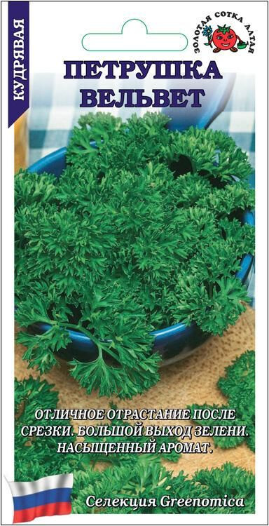 Сорт среднеспелый, холодостойкий, дает большой выход зелени с ранней весны и до поздней осени. Розетка листьев полувертикальная, высотой до 35-40 см, с очень плотной облиственностью. Листья темно-зеленые, крупные, широкотреугольной формы, средне волнистые, сочные, с насыщенным ароматом, хорошо отрастают после срезки и долго сохраняют товарный вид. Сорт используется в качестве приправы, добавляется в салаты и прекрасно подходит для украшения блюд.