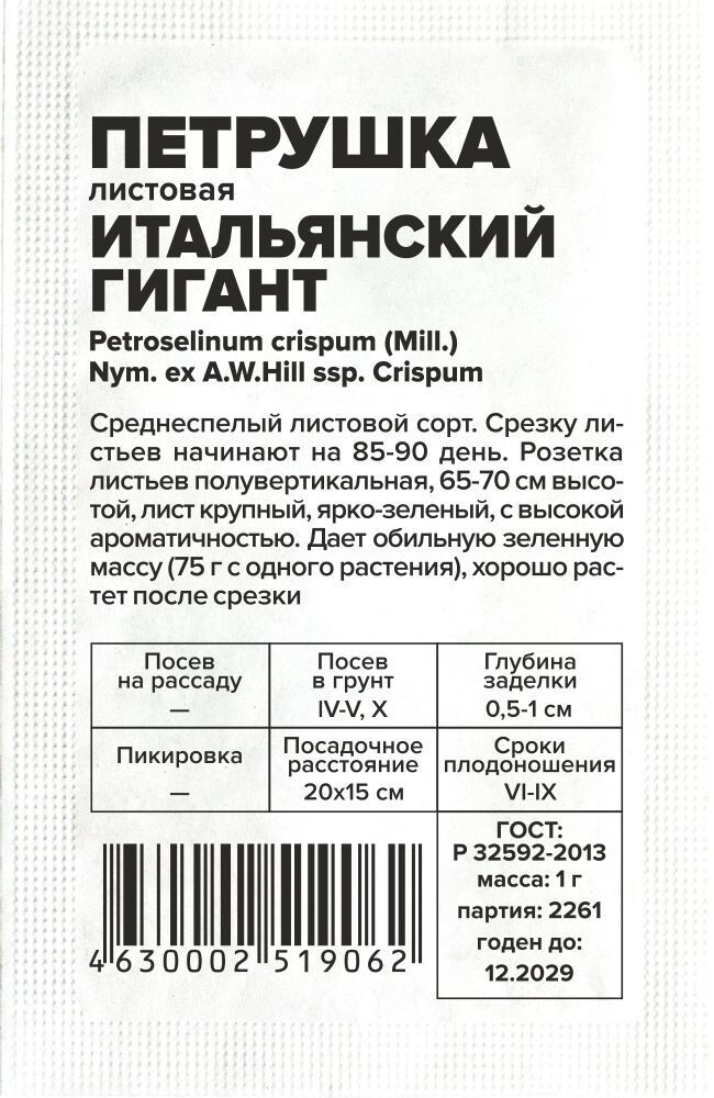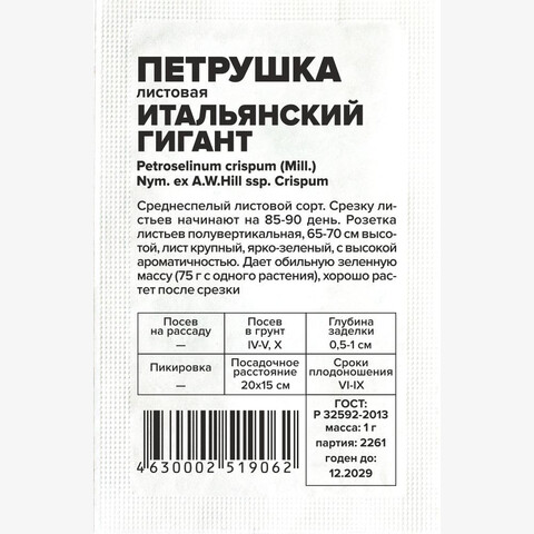 Среднеспелый листовой сорт. Срезку листьев начинают на 85-90 день. Розетка листьев полувертикальная, 65-70 см высотой, лист крупный, ярко-зеленый, с высокой ароматичностью. Дает обильную зеленную массу (75 г с одного растения), хорошо растет после срезки. Место посадки: предпочитает плодородные, нейтральные, рыхлые почвы. Тяжелые почвы для нее не пригодны. Лучшие предшественники – огурец, лук, картофель, кроме растений семейства сельдерейные Освещение: обильное, выносит затенение Предпосевная подготовка: не требуется, для более ранних и дружных всходов перед посевом можно замочить семена на 10-15 минут в воде температурой +50°С Сроки посева: при прогревании почвы до +10...12°С (апрель-май), возможен подзимний посев (октябрь-ноябрь). Всходы переносят заморозки возвратные заморозки до -7°С Посев на рассаду: не предусмотрен Посев в грунт: семена раскладывают в бороздки глубиной 0,5-1 см на уплотненный увлажненный грунт, оставляя междурядья 15-20 см. Можно сеять в лунки для получения пучков Пикировка/перевалка: осенью растения можно пересадить в контейнеры и продолжить выращивание в комнатных условиях Уход: заключается в прополке, поливе и подкормках по необходимости. Для омоложения растений во второй половине лета можно провести стрижку Сбор урожая: проводят по мере отрастания зеленой массы