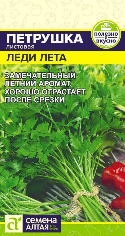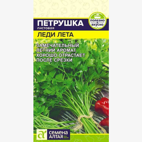 Листовая петрушка – ароматный зеленый букет. Розетка крупная, из 50-90 темно-зеленых листьев длиной около 50 см, обладающих сильным притягательным ароматом. Масса растения – 200-350 г. Потребительская спелость наступает на 70-75 день, можно производить несколько срезок за сезон, отрастание хорошее. Для выращивания в открытом и защищенном грунте. Место посадки: предпочитает плодородные, нейтральные, рыхлые почвы. Тяжелые почвы для нее не пригодны. Лучшие предшественники – огурец, лук, картофель, кроме растений семейства сельдерейные Освещение: обильное, выносит затенение Предпосевная подготовка: не требуется, для более ранних и дружных всходов перед посевом можно замочить семена на 10-15 минут в воде температурой +50°С Сроки посева: при прогревании почвы до +10...12°С (апрель-май), возможен подзимний посев (октябрь-ноябрь). Всходы переносят заморозки возвратные заморозки до -7°С Посев на рассаду: не предусмотрен Посев в грунт: семена раскладывают в бороздки глубиной 0,5-1 см на уплотненный увлажненный грунт, оставляя междурядья 15-20 см. Можно сеять в лунки для получения пучков Пикировка/перевалка: осенью растения можно пересадить в контейнеры и продолжить выращивание в комнатных условиях Уход: заключается в прополке, поливе и подкормках по необходимости. Для омоложения растений во второй половине лета можно провести стрижку Сбор урожая: проводят по мере отрастания зеленой массы
