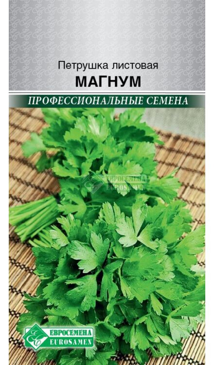 Практически каждый огородник выращивает на своих грядках пряные травы. В России пальму первенства удерживают укроп и петрушка, без них трудно представить овощные салаты, борщи, щи и тем более разные соленья. Зелень петрушки, с ее многочисленными полезными свойствами, используется для приготовления различных блюд, причем добавляют ее как в свежем виде, так и в сушеном. Корневая часть добавляется в подливы, соусы и первые блюда. Семена используются при консервировании овощей. Свежие листья служат превосходным украшением блюд, придавая им пикантность и аппетитность. В народной медицине ее используют для укрепления десен и как средство, сохраняющее зрение. Магнум - среднеспелый сорт листовой петрушки (60-70 дней от появления всходов до начала уборки урожая). Рекомендуется для всесезонного выращивания. В зависимости от периода выращивания в розетке формируется до 40 листьев. Корневая система требовательная к субстрату. Листовая пластинка длинной 25-30 см, насыщенной темно-зеленой окраски с глянцевым блеском. Листья очень ароматные, после срезки долгое время не желтеют и сохраняют высокие потребительские качества.