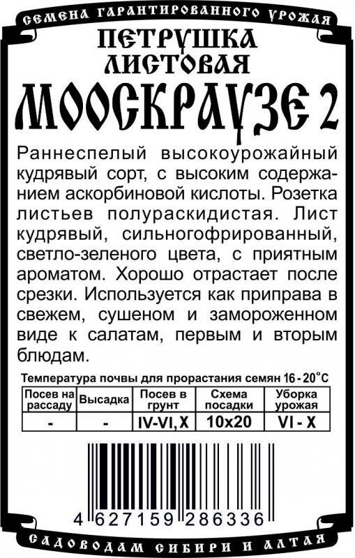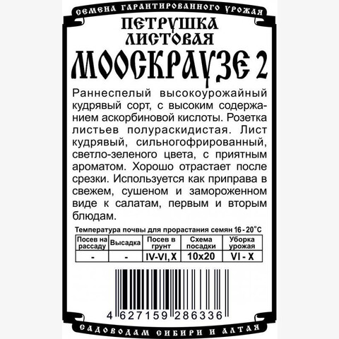 Раннеспелый высокоурожайный сорт, с высоким содержанием аскорбиновой кислоты. Розетка листьев полураскидистая. Лист кудрявый, сильногофрированный, светло-зеленого цвета, с приятным ароматом. Хорошо отрастает после срезки. Используется как приправа в свежем, сушеном и замороженном виде к салатам, первым и вторым блюдам.