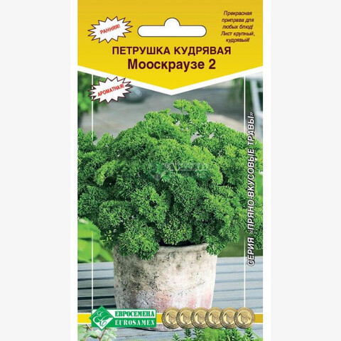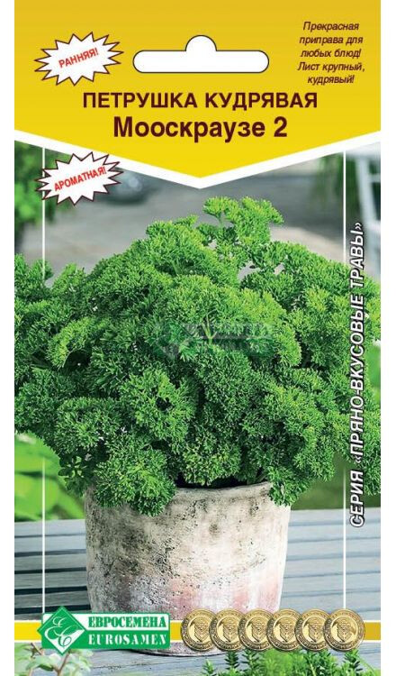 Петрушка — популярный и любимый многими зеленый листовой овощ. Она выращивается практически повсеместно, так как очень неприхотлива к почве и климату. Зелень петрушки, с ее многочисленными полезными свойствами, используется для приготовления различных блюд, служа ароматной приправой к дичи, мясу, рыбе, супам, салатам и рагу. Причем добавляют ее как в свежем виде, так и в сушеном. Корневая часть добавляется в подливы, соусы и первые блюда. Семена используются при консервировании овощей. Свежие листья служат превосходным украшением блюд, придавая им пикантность и аппетитность. В народной медицине ее используют для укрепления десен и как средство, сохраняющее зрение. Мооскраузе 2- раннеспелый сорт для выращивания в открытом грунте. Масса в открытом грунте 1 растения 30-40 г. Хорошо отрастает после срезки, и продолжительное время сохраняет товарный вид.