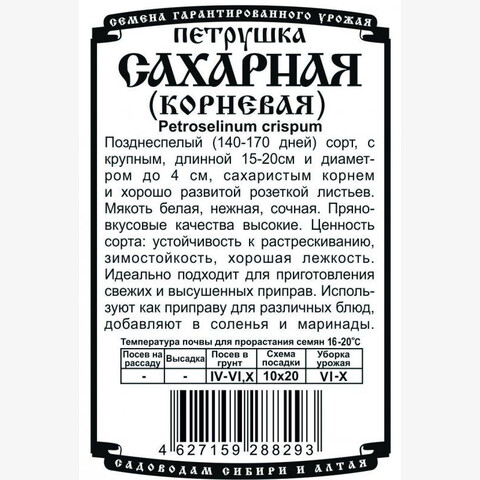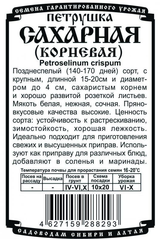 Позднеспелый (140-170дней) сорт, c крупным, длинной 15-20см и диаметром до 4 см, сахаристым корнем и хорошо развитой розеткой листьев. Мякоть белая, нежная, сочная. Пряно-вкусовые качества высокие. Ценность сорта: устойчивость к растрескиванию, зимостойкость, хорошая лежкость. Идеально подходит для приготовления свежих и высушенных приправ. Используют как приправу для различных блюд, добавляют в соленья и маринады.