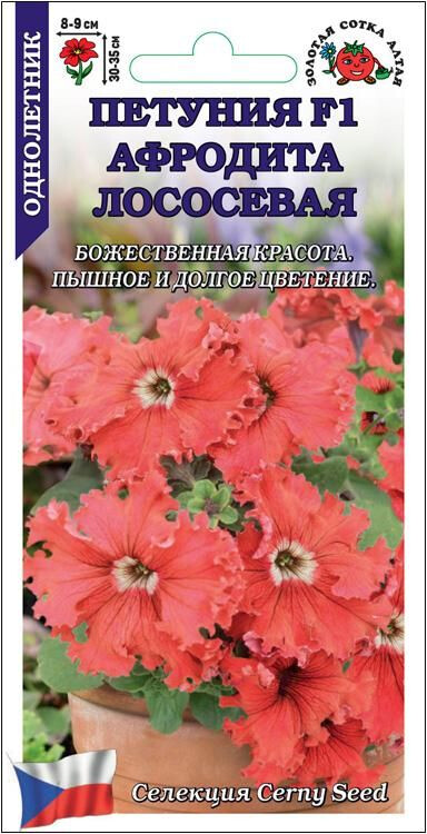 Уникальная серия петуний, таких же великолепных и божественно красивых, как рождённая из морской пены греческая богиня Афродита. Растение ветвистое, компактное, шаровидное, с прочными побегами и аккуратными листочками, цветет пышно и длительно, устойчиво к непогоде. Крупные нежно-лососевые цветы украшены по краям изящными рюшами. Превосходное украшение любых цветников и контейнеров.