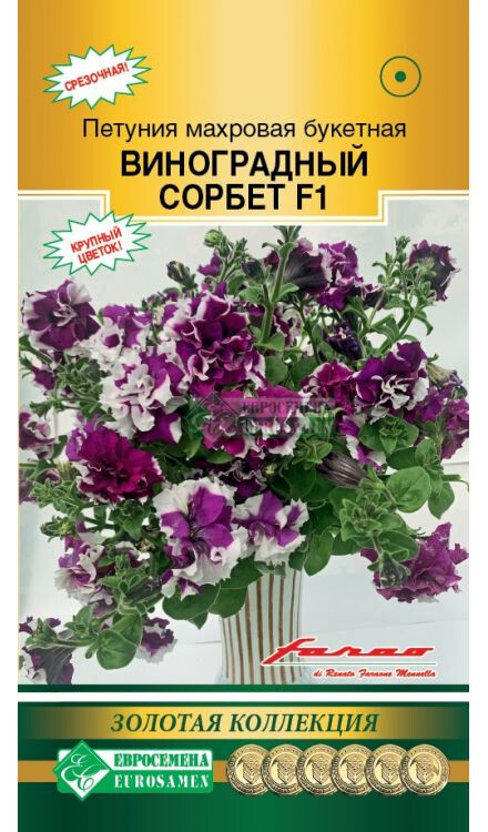 Петуния - настоящий фаворит в озеленении в настоящее время. Это украшение клуб, рабаток, окон, балконов, вазонов, цветников, бордюров – где только ее не встретишь! Щедрое цветение, фантастическое сочетание окрасок цветков создают нарядную, праздничную атмосферу, а контрастные расцветки придают цветкам некую торжественность. С каждым годом появляется все больше и больше различных гибридов этого популярного растения, но появление этого гибрида произвело настоящий фурор. Виноградный Сорбет- представительница одной из первой в мире 100 % махровой крупноцветковой петунии серии Allegra для срезки при формировании в 1 стебель. Растения ветвистые, с прочными стеблями, цветки очень крупные (10-14 см) , фиолетового цвета с белыми всполохами. Отличается обильным, ранним и продолжительным цветением, шикарно и непревзойденно смотрится в срезке, распуская в воде все свои бутоны.