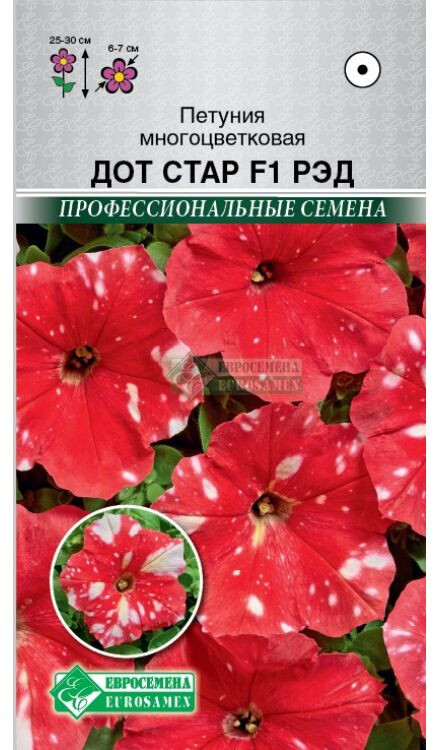 Уникальный гибрид новейшей серии петунии Dot Star F1, способный своей необыкновенной окраской и безумно красивым внешним видом создать бесконечную вселенную, звездное небо, тайны космоса или простую радость и веселое настроение как на клумбах открытого грунта, так и в подвесных корзинах, вазонах и балконных ящиках. Удачно сочетаются белые крапинки и пятнышки с яркой окраской цветков, их частота, форма и интенсивность меняется при переменчивой и жаркой погоде настолько, что цветки становятся похожими на оригинал укорененных черенков с такой же окраской. Растения отлично ветвятся, обильно и продолжительно цветут, способны быстро восстановить свой великолепный внешний вид после сильных дождей и переувлажнения. Выдающаяся всхожесть и качество семенного материала!