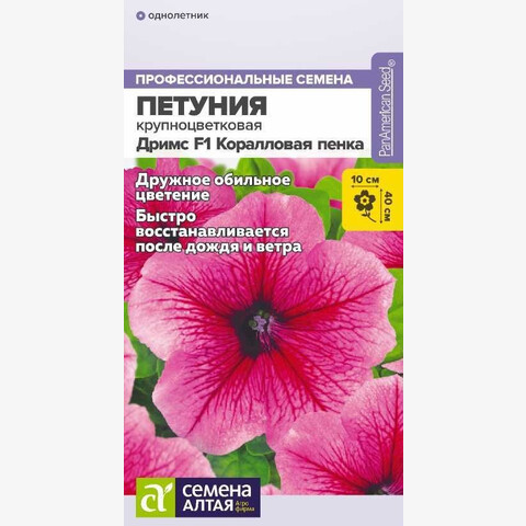 Гибридная крупноцветковая петуния, отличающаяся хорошим иммунитетом, выровненностью габитуса, насыщенностью окрасок и дружным обильным цветением. Быстро восстанавливается после сильного ветра и дождя. Растение хорошо ветвится. Цветки крупные, кораллово-розового цвета с темно-розовыми прожилками. Высота растения: 25-40 см Диаметр цветка: 8-10 см Условия выращивания, место посадки: солнечные участки Требования к грунту: питательный легкий грунт, от слабокислого до нейтрального Способы выращивания: рассадный Время посева на рассаду: февраль-апрель Способ посева: семена высевают на уплотненное ложе замоченных торфяных таблеток или увлажненного грунта, не заделывая. Драже увлажняют теплой водой до размягчения. Емкость накрывают прозрачной крышкой или пленкой до появления первых всходов, периодически проветривают. Обеспечивают досветку посевов не менее 10-12 часов в сутки, температуру 22-24°С Время до появления всходов: 3-5 дней Перевалка: производится через 4-5 недели от всходов. Объем индивидуальных емкостей не менее 0,5 л. При прорастании корней через дренажные отверстия перевалка в больший объем грунта Время высадки в открытый грунт: май-июнь, не менее 6-7 недель от посева Посадочное расстояние: 25-35 см Период цветения: май-сентябрь Уход: рекомендуется провести прищипывание побегов для стимуляции ветвления на 4-5 неделе. Первую подкормку проводят через 10-14 дней от появления всходов комплексным минеральным удобрением, далее – 1 раз в 7 дней. В начале бутонизации из подкормок убирают азот. Для более продолжительного и декоративного цветения рекомендуется удалять увядшие соцветия. Внимание! Семена дражированные, оболочку драже не разрушать, она растворяется при поливе!