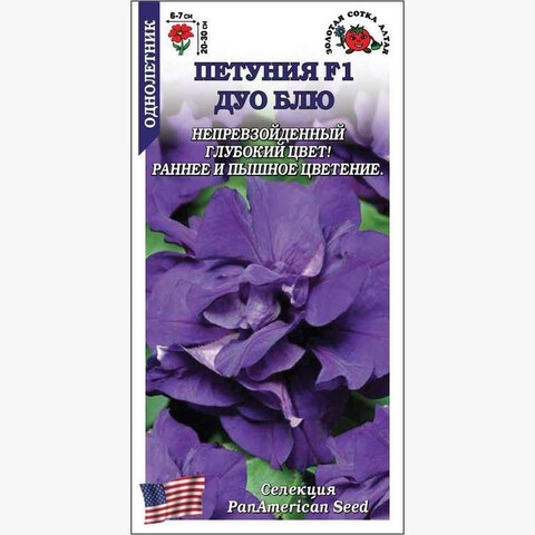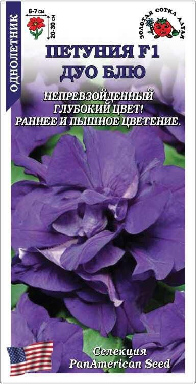 Петуния серии ДУО цветет пышно и длительно, отличается компактным кустом с небольшими аккуратными листочками и обилием махровых цветков с сильногофрированными лепестками яркого синего цвета. Петуния прекрасно подходит для создания ярких клумб и бордюров, великолепно смотрится в вазонах, ящиках и подвесных кашпо, используется для украшения помещений.