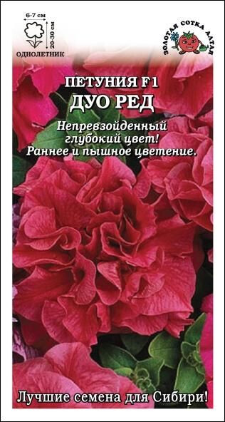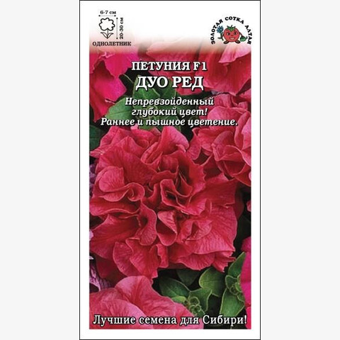 Петуния серии ДУО отличается компактным кустом, высотой 20-30 см, с небольшими аккуратными листочками и обильем махровых цветков с сильногофрированными лепестками, диаметром 6-7 см, яркого красного цвета. Цветение пышное и длительное. Прекрасно подходит для создания ярких клумб, бордюров, великолепно смотрится в подвесных кашпо, вазонах и балконных ящиках, используется как горшечное растение для украшения помещений.