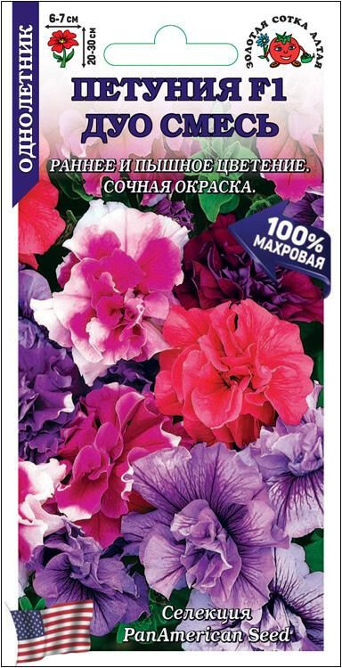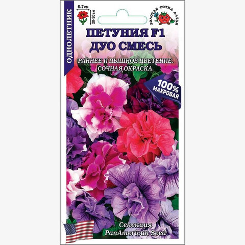 Гибридные петунии серии ДУО устойчивы к неблагоприятным погодным условиям, зацветают рано, цветут пышно и длительно. Растения низкорослые, компактные, с небольшими аккуратными листочками и обилием 100% махровых цветов с сильногофрированными лепестками. Окраска весьма разнообразна, может быть как однотонной, так и двухцветной. Петунии используются для создания ковровых клумб, рабаток и бордюров, великолепно смотрятся в подвесных кашпо, вазонах и балконных ящиках, прекрасно подходят для интерьерного озеленения.