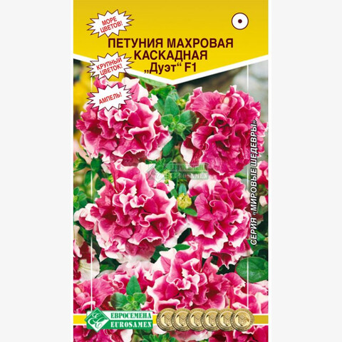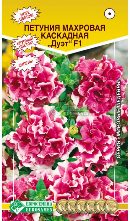 Рады представить Вам новую, очень яркую представительницу класса махровых каскадных петуний. В пору цветения она представляет собой грандиозную картину. Ее необыкновенные, крупные, шаровидные цветки сочетают в себе различные тона и оттенки, от яркого розового до чистого белого. Необычная двуцветная окраска и сильная гофрировка края лепестка придают изящество гигантским цветкам. Растение густо покрывается цветками, почти полностью скрывающими длинные побеги, каскадом спадающими через края контейнеров и вазонов. При выращивании на клумбах одно растение создаст настоящий цветущий ковер в диаметре 1,5 м2. площади, благодаря отличному ветвлению боковых побегов. Идеальное украшение для балконов, подвесных корзин и кашпо.