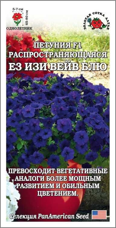 Петунии серии E3 Easy Wave менее требовательны к длине светового дня, формируют плотные аккуратные и чрезвычайно компактные кустики, долго сохраняют привлекательность, цветут продолжительно и очень обильно. Цветы многочисленные, воронко-видные, глубокого сине-фиолетового цвета. Разрастаясь, плети образуют сплошной ковер площадью до 1 м2, а в подвесных кашпо и вазонах на ножке формируют красивую куполообразную крону.