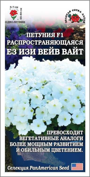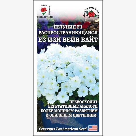 Петунии серии E3 Easy Wave менее требовательны к длине светового дня, долго сохраняют привлекательность, цветут продолжительно и очень обильно, формируют плотные аккуратные и чрезвычайно компактные кустики. Цветы белоснежные, многочисленные, воронковидной формы. Разрастаясь, плети образуют сплошной ковер площадью до 1 м2, а в подвесных кашпо и вазонах на ножке формируют красивую куполообразную крону.