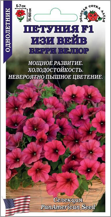 Петунии Easy Wave холодостойкие, пышно цветут и сохраняют декоративность до заморозков. Растения сначала растут вверх, образуя куполообразные кустики, а затем наращивают плети длиной до 1 м. Цветы душистые, многочисленные, от кораллово-красных до вишнево-красных, в центре более темные. На клумбах петунии этой серии образуют сплошной ковер, а в подвесных кашпо и вазонах на ножке формируют красочный каскад.