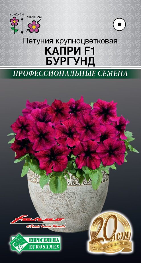 В середине XVIII столетия был выведен первый в мире гибридный образец, сегодня петуния имеет более 30 основных видов и несколько десятков гибридных единиц. Капри- универсальный гибрид крупноцветковой петунии с прекрасной адаптацией к широкому диапазону температур, от минус 5°С до плюс 40°С, который не прекращает свой рост даже при низких температурах. Благодаря гену мужской стерильности растения непрерывно и обильно цветут с ранней весны до поздней осени, производят огромное количество цветков в течение всего периода вегетации, способны к интенсивному ветвлению. Отличается устойчивостью растений к серой гнили и идеально подходит для всех видов использования: для горшков, контейнеров, подвесных корзин, различных цветников открытого грунта.