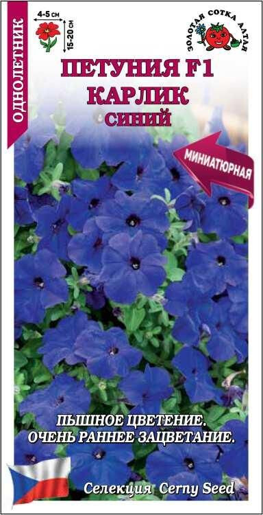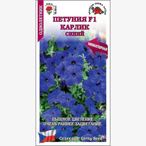 Самая ранняя петуния данной серии – зацветает через 9-10 недель от посева. Кустики компактные, очень ветвистые, обильно цветут весь сезон, одновременно раскрывая по несколько цветочков, устойчивы к непогоде. Цветы многочисленные, воронковидные, красивого синего цвета. Петунии серии Карлик предназначены прежде всего для выращивания в контейнерах, а также с успехом используются в различных цветниках.