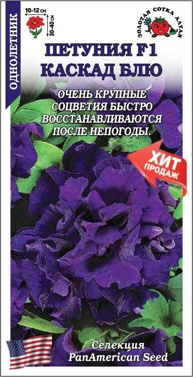 Эффектная петуния с ниспадающими побегами и аккуратными листочками, зацветает рано и цветет долго, устойчива к неблагоприятным условиям, долго сохраняет декоративность. Цветы крупные, махровые, ярко-синего цвета. Петунии прекрасно подходят для создания ковровых клумб и бордюров, великолепно смотрятся в подвесных кашпо, вазонах и ящиках, используются для украшения помещений.