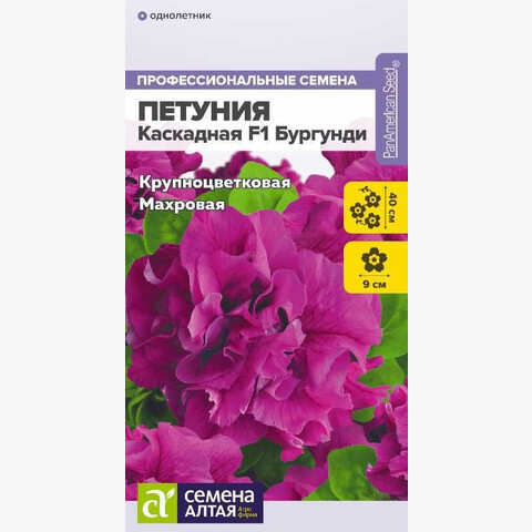 Огромные густомахровые петунии, напоминающие пышные гвоздики, образует ниспадающие побеги, покрытые во время цветения шлейфом цветков темно-вишневой окраски. Отличаются быстрым ростом и обильным цветением уже во второй месяц после посева. Подходят для балконных ящиков, больших кашпо и высадки в открытый грунт. Длина побегов: 35-40 см. Диаметр цветка: 8-9 см. Условия выращивания, место посадки: солнечные участки Требования к грунту: питательный легкий грунт, от слабокислого до нейтрального Способы выращивания: рассадный Время посева на рассаду: февраль-март Способ посева: семена высевают на уплотненное ложе замоченных торфяных таблеток или увлажненного грунта, не заделывая. Драже увлажняют теплой водой до размягчения. Емкость накрывают прозрачной крышкой или пленкой до появления первых всходов, периодически проветривают. Обеспечивают досветку посевов не менее 10-12 часов в сутки и температуру 22-24°С Время до появления всходов: 3-5 дней Перевалка: производится через 2-3 недели от всходов. Объем индивидуальных емкостей не менее 0,5 л. При прорастании корней через дренажные отверстия перевалка в больший объем грунта Время высадки в открытый грунт: май-июнь, не менее 5-6 недель от посева Посадочное расстояние: 30-40 см Период цветения: май-сентябрь Уход: рекомендуется провести прищипывание побегов для стимуляции ветвления на 4-5 неделе. Первую подкормку проводят через 10-14 дней от появления всходов комплексным минеральным удобрением, далее – 1 раз в 7 дней. В начале бутонизации из подкормок убирают азот. Внимание! Семена дражированные, оболочку драже не разрушать, она растворяется при поливе!