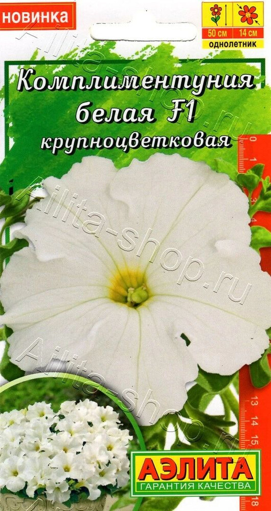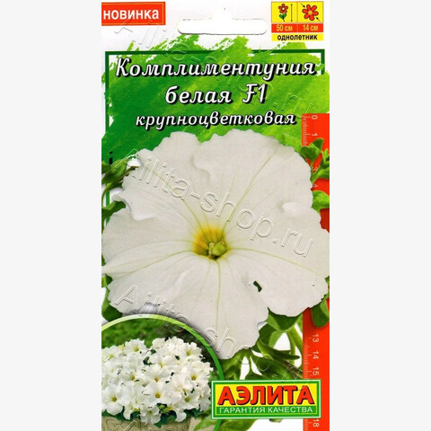 «Давайте говорить друг другу комплименты». Когда трудно подобрать нужные слова, на помощь придут цветы. Комплиментуния– стильное, эффектное и очень изящное растение. Это романтичный, практичный выбор и комплимент на языке цветов. Комплиментуния– эксклюзивный гибрид (новая петуния) с крупными цветками и суперобильным цветением. Украсит любой цветник и будет долго дарить радость и восхищение. Благодаря наличию гена мужской стерильности семян не завязывает, направляя всю энергию на формирование новых цветков. Форма растений кустовая: ширина больше высоты. Высота 20-25 см, ширина 25-30 см. Быстро разрастается. Растения устойчивы к болезням, выдерживают дождливую и ветреную погоду, переносят кратковременные заморозки до –5°С и экстремальную жару до +40°С без потери декоративности. Семена в гранулах! Гранулы располагают на поверхности почвы, не заделывая их, хорошо увлажняют из распылителя. При попадании влаги на гранулу оболочка должна раствориться.