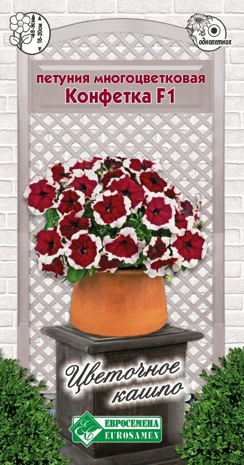 Петуния – растение из семейства паслёновых культур. В середине XVIII столетия был выведен первый в мире гибридный образец, сегодня петуния имеет более 30 основных видов и несколько десятков гибридных единиц. Конфетка - лучшая представительница серии пикоти среди существующих многоцветковых петуний, идеально подходящих для сада. Отличается высокой устойчивостью к неблагоприятным погодным условиям, быстро восстанавливается после дождей и обильного полива, прекрасно переносит жару, не теряя своей высокой декоративности. Цветки цвета бургунд с белой полоской пикоти будут постоянно цвести на протяжении всего лета, сводя с ума буквально всех вокруг своим неповторимым колоритом. У нее неукротимая мощь цветения, способна густо и быстро покрывать компактные кустики яркими и многочисленными цветками, великолепно подходит для оформления комфортных и романтических уголков для отдыха. Незаменимое растение для озеленения различных клумб, рабаток, кашпо, балконов и лоджий.