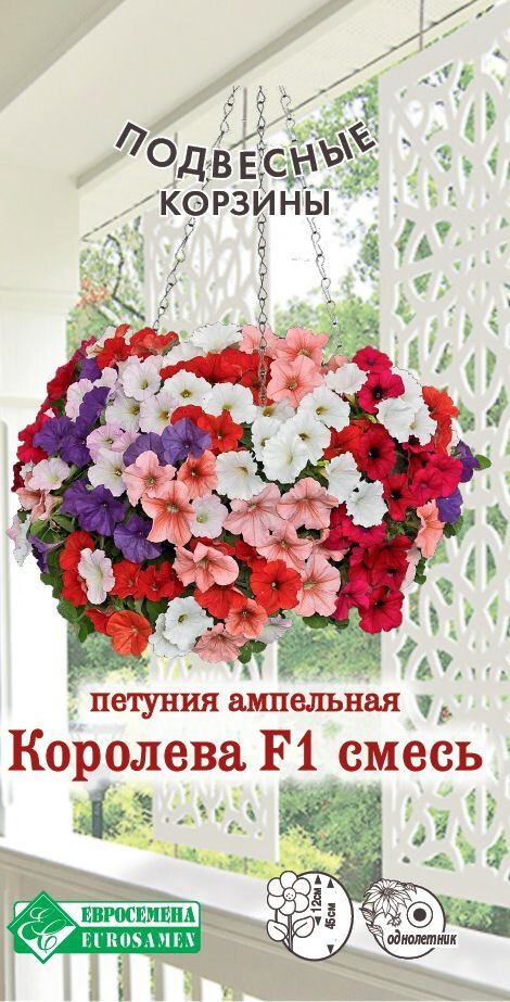 Петуния стала в настоящее время королевой среди популярных цветочных растений. Ее выращивают сами, покупают в готовом виде уже цветущей либо в виде рассады, с большой любовью высаживают ее в различные цветники открытого грунта, напольные горшки и контейнеры, подвесные вазоны, балконные ящики, а ведь еще совсем недавно прохожие с удивлением разглядывали редкие балконы городских домов, украшенные красивой шапкой цветов. Королева- уникальная смесь ампельной петунии, изумительные цветки которой раскрываются один за другим без перерыва с июля по октябрь и своей сияющей окраской привлекают к себе внимание еще издалека. На клумбе эта петуния способна создавать ковер в диаметре до 60 см, благодаря отличному ветвлению боковых побегов. Компактные кустики с каскадами соцветий на поникающих стеблях идеальны для цветочных аранжировок в висячих корзинах, а также для смешанных посадок в балконных ящиках. Никакое другое растение в такой степени, как петуния, не подходит для оформления комфортных и романтических уголков для отдыха. Отличается устойчивостью к жаре, дождю и ветру, что делает ее незаменимой в оформлении Ваших садов.