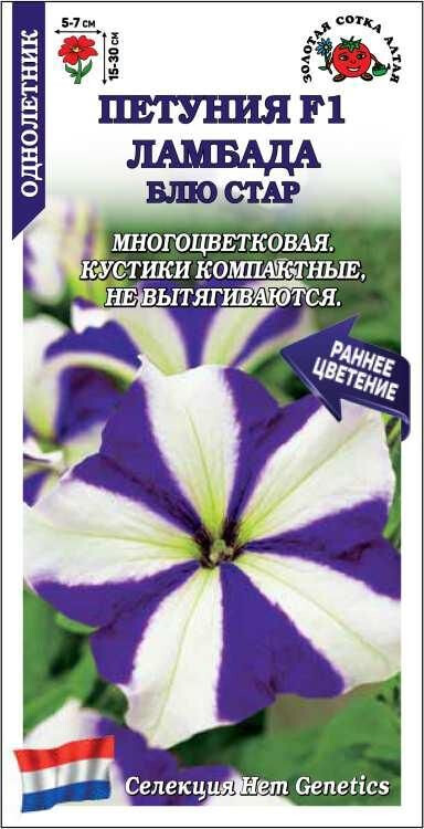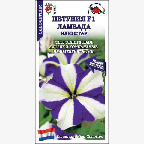 Петунии Ламбада образуют компактные, хорошо разветвленные кустики, не вытягиваются, достигают высоты 15-20 см в горшках и 25-30 см в цветниках. Цветы многочисленные, сине-фиолетовые с белой звездой в центре. Петунии этой серии великолепны в кашпо, вазонах и ящиках, отлично подходят для цветников, где образуют сплошной ковер из цветов. Зацветают рано и обильно цветут до заморозков.