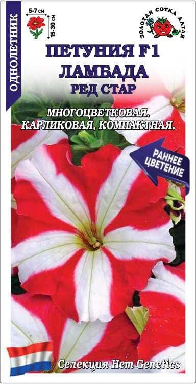 Петунии Ламбада зацветают рано и цветут обильно в течение всего сезона. Кустики карликовые, хорошо разветвленные, не вытягиваются, в горшках достигают высоты 15-20 см, в цветниках – 25-30 см. Цветы многочисленные, ярко-красные с белой звездой в центре. Петунии этой серии великолепны в кашпо, вазонах и ящиках, отлично подходят для цветников, где образуют сплошной ковер из цветов.