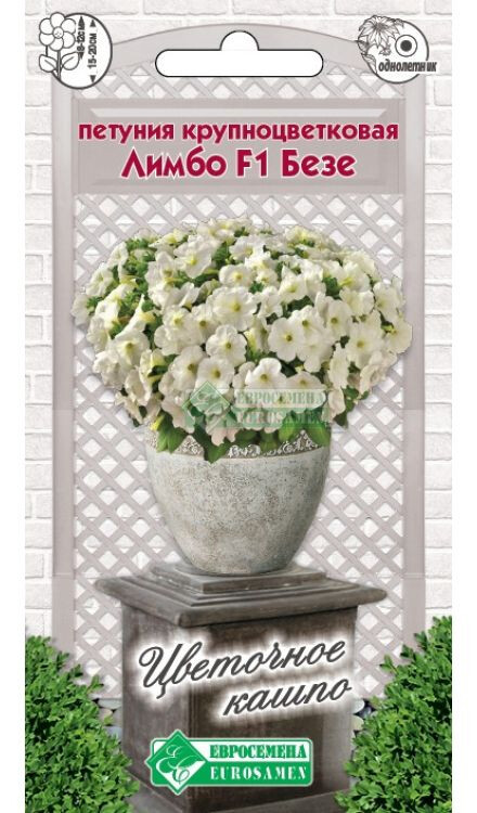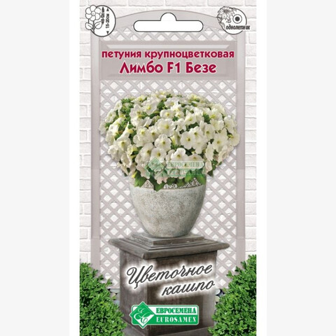 Петуния – растение из семейства паслёновых культур. В середине XVIII столетия был выведен первый в мире гибридный образец, сегодня петуния имеет более 30 основных видов и несколько десятков гибридных единиц. Серия Лимбо- это новое поколение генетически карликовых петуний с обозначением GP, она более компактна по сравнению с петунией предыдущего поколения, имеет лучшую разветвленность куста с более короткими междоузлиями, не требующая регуляторов роста и обильно цветущая на протяжении всего сезона. Ее отличительной особенностью является формирование большого по площади куста при сохранении низкорослости. Безе- цветок с очень нежным белоснежным окрасом. Растение имеет прекрасную выравненность, не вытягивается, но при этом разрастается в ширину на 30 см, быстро восстанавливается после дождя. Подходит для производства в горшках, вазонах, контейнерах и высадки в открытый грунт.