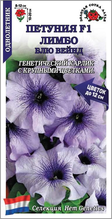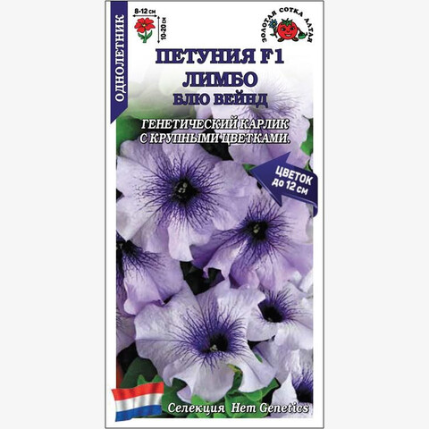 Серия генетически карликовых петуний. Кустики ветвистые, не вытягиваются, но отлично разрастаются в ширь, в горшках достигают высоты 10-15 см, в цветниках – до 20 см. Цветы крупные, воронковидные, голубого цвета с темно-фиолетовым жилкованием. Петунии Лимбо великолепны в вазонах и ящиках, идеальны для создания бордюров и клумб, отличаются ранним и долгим цветением, устойчивы к непогоде.
