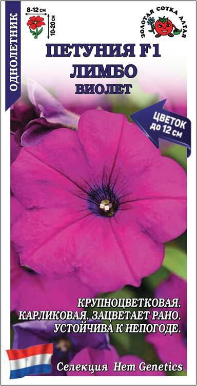 Серия генетически карликовых петуний, идеально подходящих для выращивания в различных контейнерах и создания ковровых цветников. Растения ветвистые, не вытягиваются, но отлично разрастаются в ширь; высота в горшках 10-15 см, в цветниках – до20 см. Цветы крупные, воронковидные, красивого сиренево-фиолетового оттенка. Петунии Лимбо отличаются ранним и долгим цветением, устойчивы к непогоде.