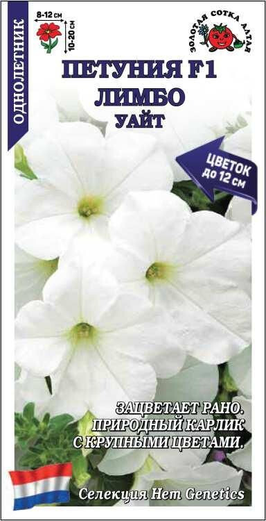 Серия генетически карликовых петуний. Кустики не вытягиваются, хорошо ветвятся и отлично разрастаются вширь; высота в горшках 10-15 см, в открытом грунте – до 20 см. Цветы крупные, воронковидные, чистого белого цвета. Петунии Лимбо великолепны в вазонах и ящиках, идеальны для создания ковровых бордюров и клумб, отличаются ранним и долгим цветением, устойчивы к непогоде.