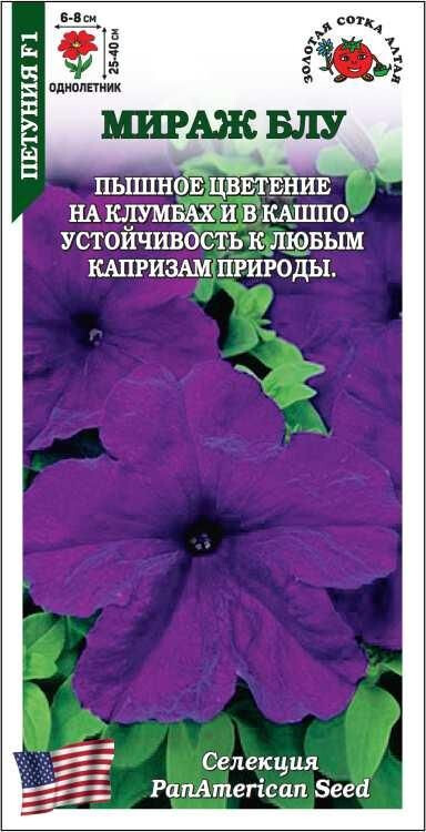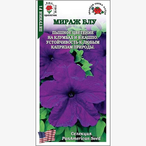 Петунии серии Mirage зарекомендовали себя устойчивостью ко всем капризам природы: они не боятся ни дождя, ни ветра, ни жары, стойко выдерживают похолодания. Растения компактные, с хорошей ветвистостью, поражают пышностью цветения. Цветки ярко-синего цвета, крупные, ароматные. Прекрасный материал для создания ярких клумб, бордюров, великолепно смотрится в подвесных кашпо, вазонах и балконных ящиках.