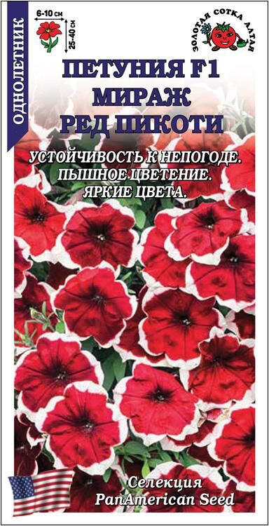 Петунии серии Mirage зарекомендовали себя устойчивостью ко всем капризам природы: они не боятся ни дождя, ни ветра, ни жары, стойко выдерживая любую непогоду до самых заморозков. Растения компактные, с хорошей ветвистостью, отличаются пышностью цветения. Цветки крупные, ароматные, ярко-красного цвета с белой контрастной каймой. Великолепный материал для создания ярких клумб, рабаток и бордюров, прекрасное украшение подвесных кашпо, вазонов и балконных ящиков.