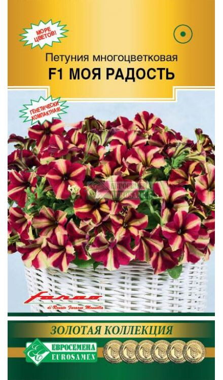 Сегодня петуния стала украшением клуб, рабаток, окон, балконов, вазонов, цветников, бордюров – где только ее не встретишь! Роскошные каскады цветов радуют нас с наступления лета до самых холодов. Щедрое цветение, фантастическое сочетание окрасок цветков создают нарядную, праздничную атмосферу, а контрастные расцветки придают цветкам некую торжественность. С каждым годом появляется все больше и больше различных гибридов этого популярного растения, но появление этого гибрида произвело настоящий фурор среди любителей огромного класса петуний. Моя Радость- новый тип многоцветковой петунии с компактным габитусом и необычайно богатым, обильным и продолжительным цветением. Цветки просто потрясающей окраски, насыщенного бордового цвета с желтой звездой, плотные, устойчивые к осадкам и ветру. В течение всего сезона растения сохраняют аккуратную форму, не требуя прищипки. Компактность наследуется генетически. Кустики похожи на ровные, пышные, цветущие шарики. Благодаря гену мужской стерильности гибрид не завязывает семян и цветет постоянно – с ранней весны до поздней осени. Гибрид идеально подходит для садовых ваз и балконных ящиков. Не содержит ГМО! Высота растения-25-30 см Диаметр цветка-7-8 см