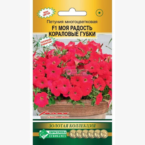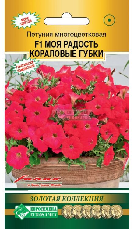 Сегодня петуния стала украшением клуб, рабаток, окон, балконов, вазонов, цветников, бордюров – где только ее не встретишь! Щедрое цветение, фантастическое сочетание окрасок цветков создают нарядную, праздничную атмосферу, а контрастные расцветки придают цветкам некую торжественность. С каждым годом появляется все больше и больше различных гибридов этого популярного растения, но появление этого гибрида произвело настоящий фурор. Моя Радость- новый тип многоцветковой петунии с компактным габитусом и необычайно богатым, обильным и продолжительным цветением. Цветки коралло-розовой окраски, плотные, устойчивые к осадкам и ветру. В течение всего сезона растения сохраняют аккуратную форму, не требуя прищипки. Компактность наследуется генетически. Кустики похожи на ровные, пышные, цветущие шарики. Благодаря гену мужской стерильности гибрид не завязывает семян и цветет постоянно – с ранней весны до поздней осени. Гибрид идеально подходит для садовых ваз и балконных ящиков. Не содержит ГМО!