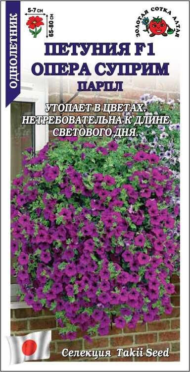 Петунии серии Opera Supreme обладают большой энергией роста, не требовательны к освещению и необычайно пышно цветут до осенних холодов. Аккуратные кустики, утопающие в привлекательных цветочках пурпурной окраски, выглядят очень ажурно и легко, напоминая облако. Гибкие ветвистые побеги на клумбах создают живописный ковер площадь до 1,2-1,5 м2, а в подвесных кашпо формируют практически правильный купол.