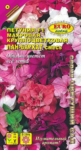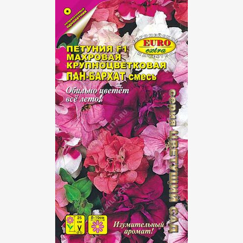 Уникальная крупноцветковая махровая петуния, отличающаяся компактностью куста, повышенной устойчивостью к неблагоприятным условиям, и длительным (с мая до глубокой осени) обильным цветением. Яркие, крупные цветы разнообразных окрасок с необыкновенным изумительным ароматом станут потрясающим украшением Ваших клумб, бордюров, рабаток, а также балконных и комнатных композиций.